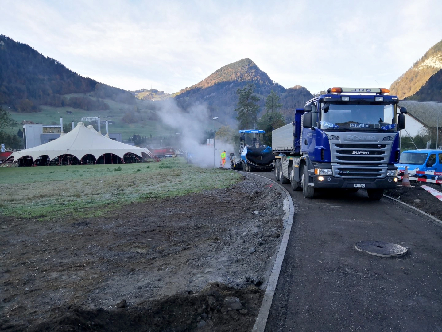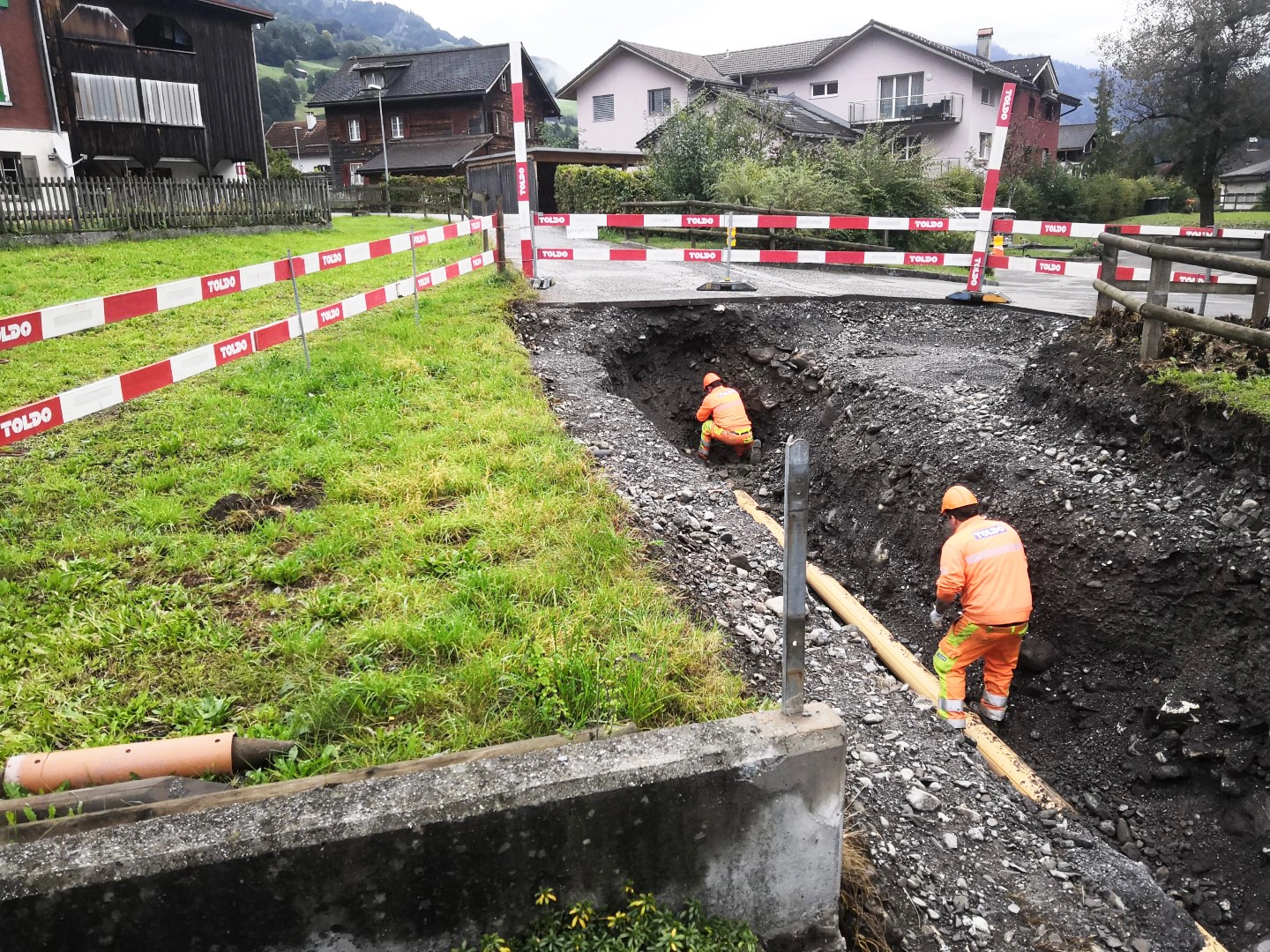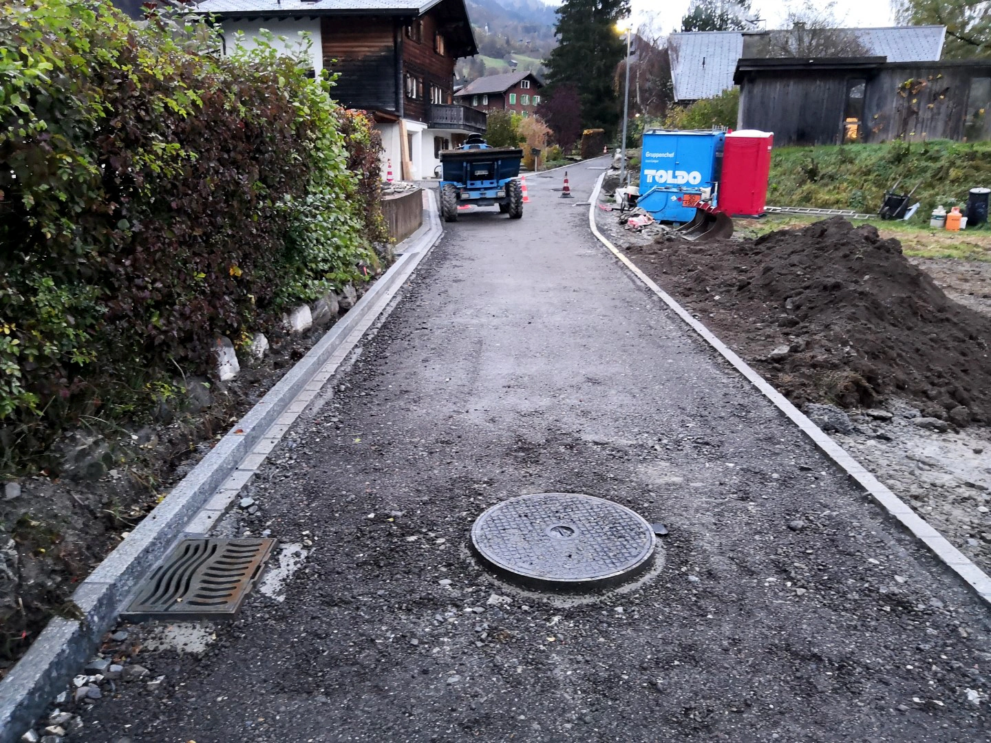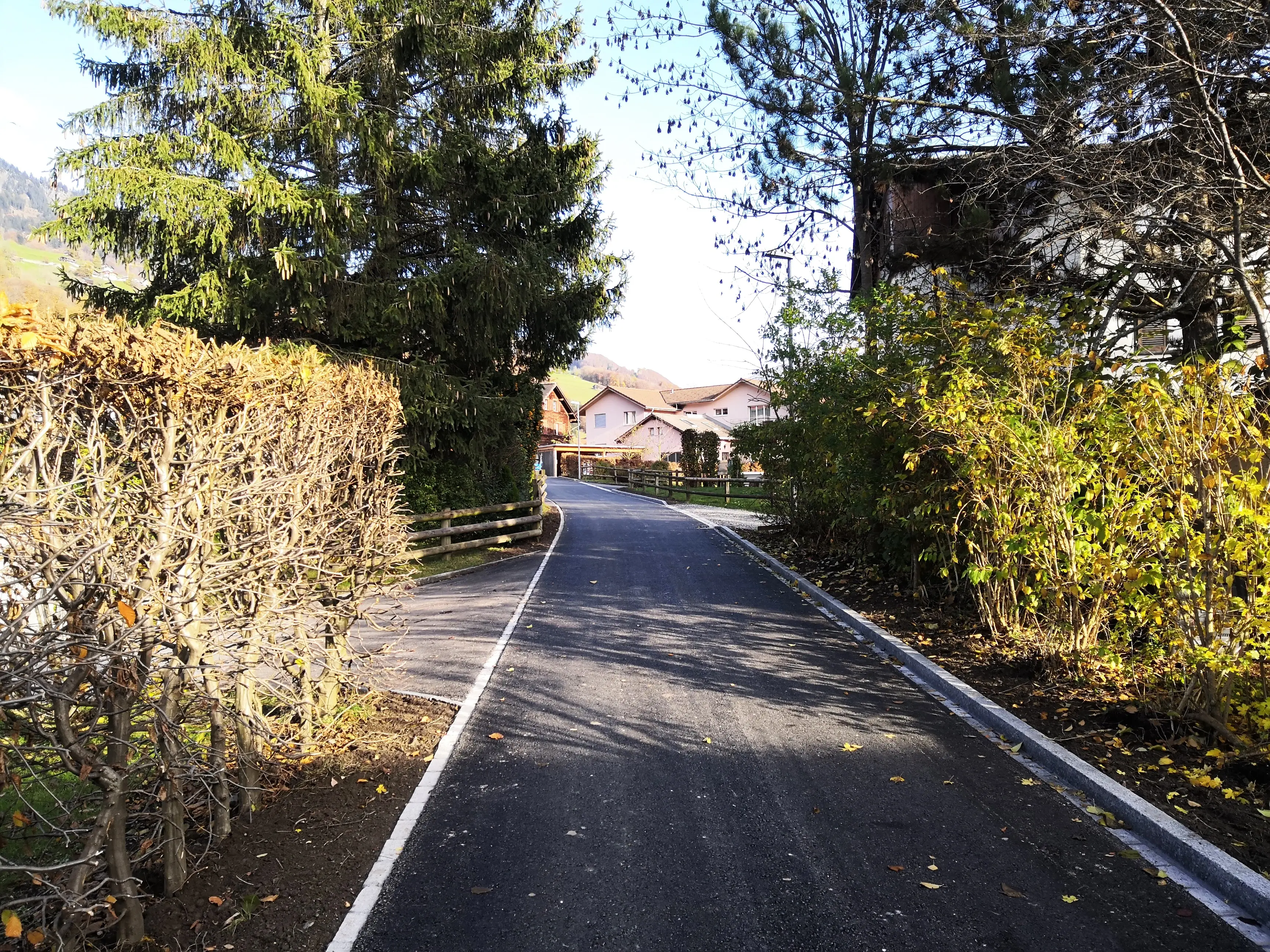Die Quartierstrasse Ruot wies erhebliche Mängel im Belag, dem Strassenaufbau und der Siedlungsentwässerung auf. Die Massnahmen sahen vor, das Mischwassersystem auf ein Trennsystem mit lokaler Sauberwasser-Versickerung und einem Schmutzwasseranschluss an der Kanalisation umzustellen und den Strassenaufbau inkl. Belag und Berandungen zu optimieren und erneuern.